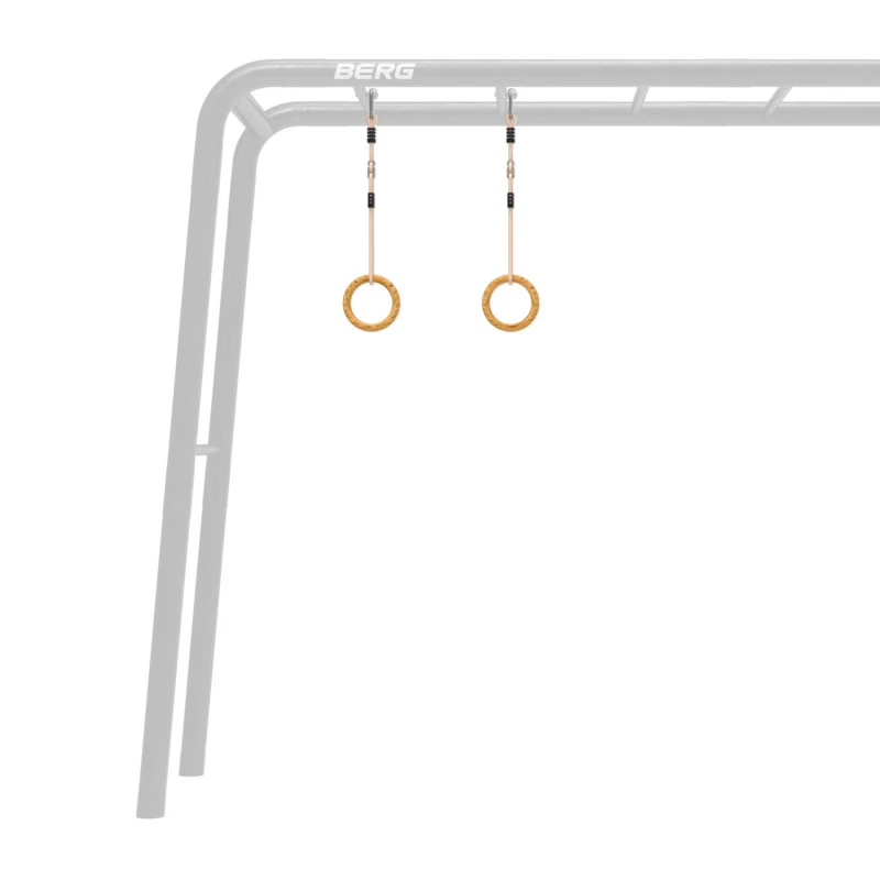 Houten turnringen als accessoire voor de BERG Playbase, het unieke multifuntionele buitenspeel concept verpakt in een hoogwaardig en stijlvol object welke niet misstaat in de tuin.