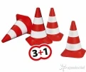 Een set van 4 robuuste pionnen in oranje met wit. Hiermee baken je bijvoorbeeld veilig “de bouwplaats” af of geef je aan waar de “rijbaan” ligt.