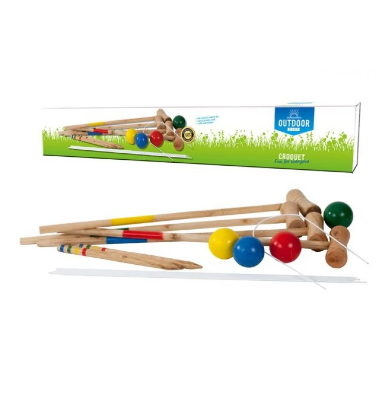 Outdoor Play Croquet set, in houten uitvoering. Sla zo snel mogelijk je eigen ballen door de poortjes en weer terug naar het startpaaltje! Inclusief uitgebreide handleiding.