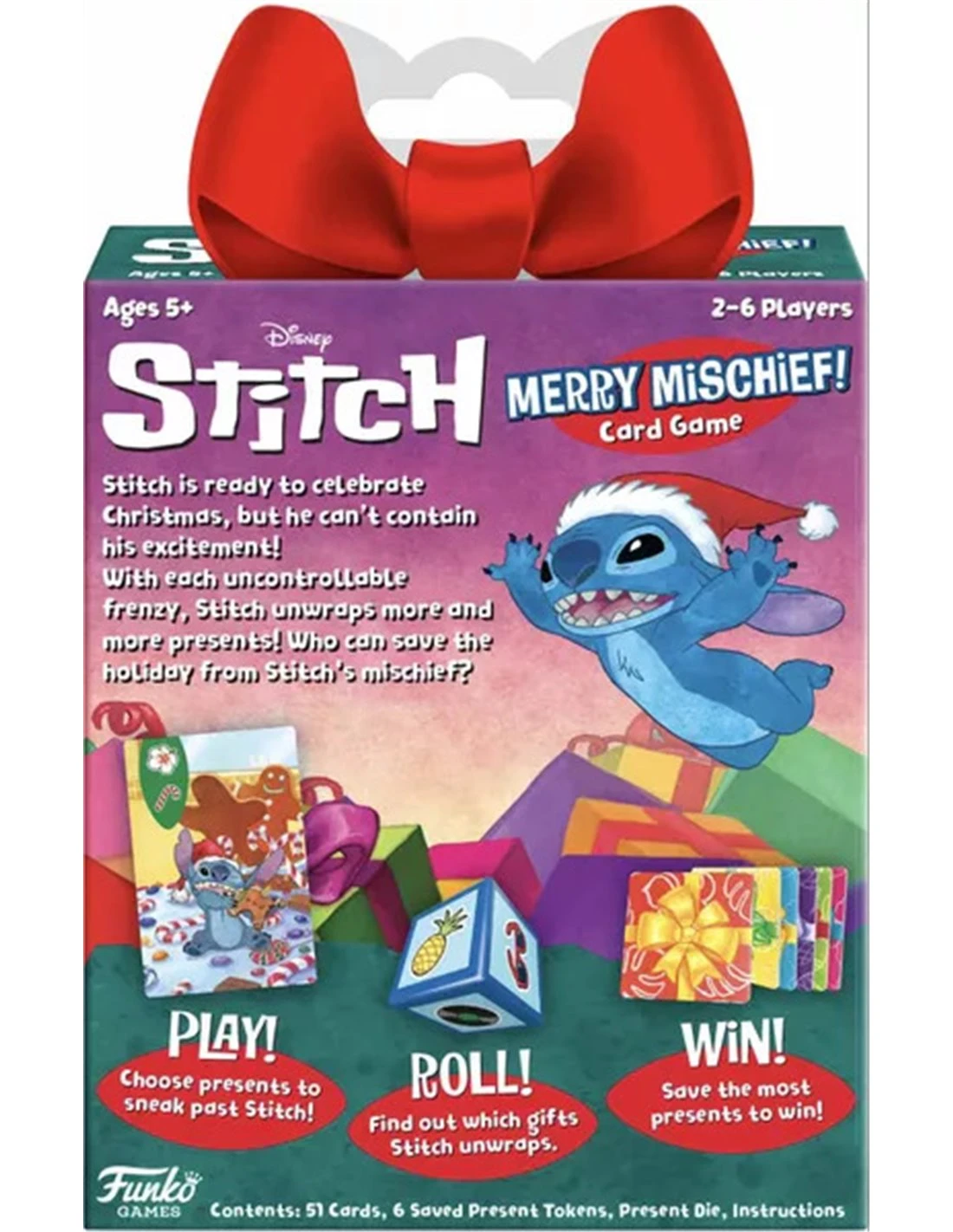 Push your luck choosing which presents to play. Watch for naughty and nice Stitch faces that affect how often you roll the die and how likely Stitch is to unwrap your presents. Custom die and watercolor-style card illustrations bring this fanfavorite character to life on your table!