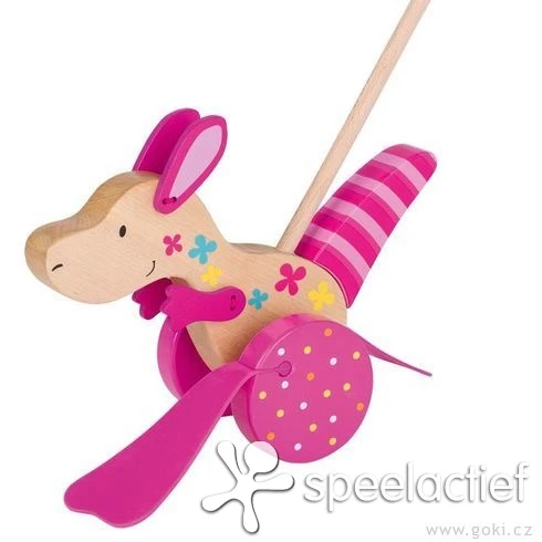 Houten duwstok Kangoeroe met flapvoetjes en een zwabberende staart. Zorgt voor een extra grappig loopje bij de wandeling. Afmetingen kangoeroe: 18,5 cm.