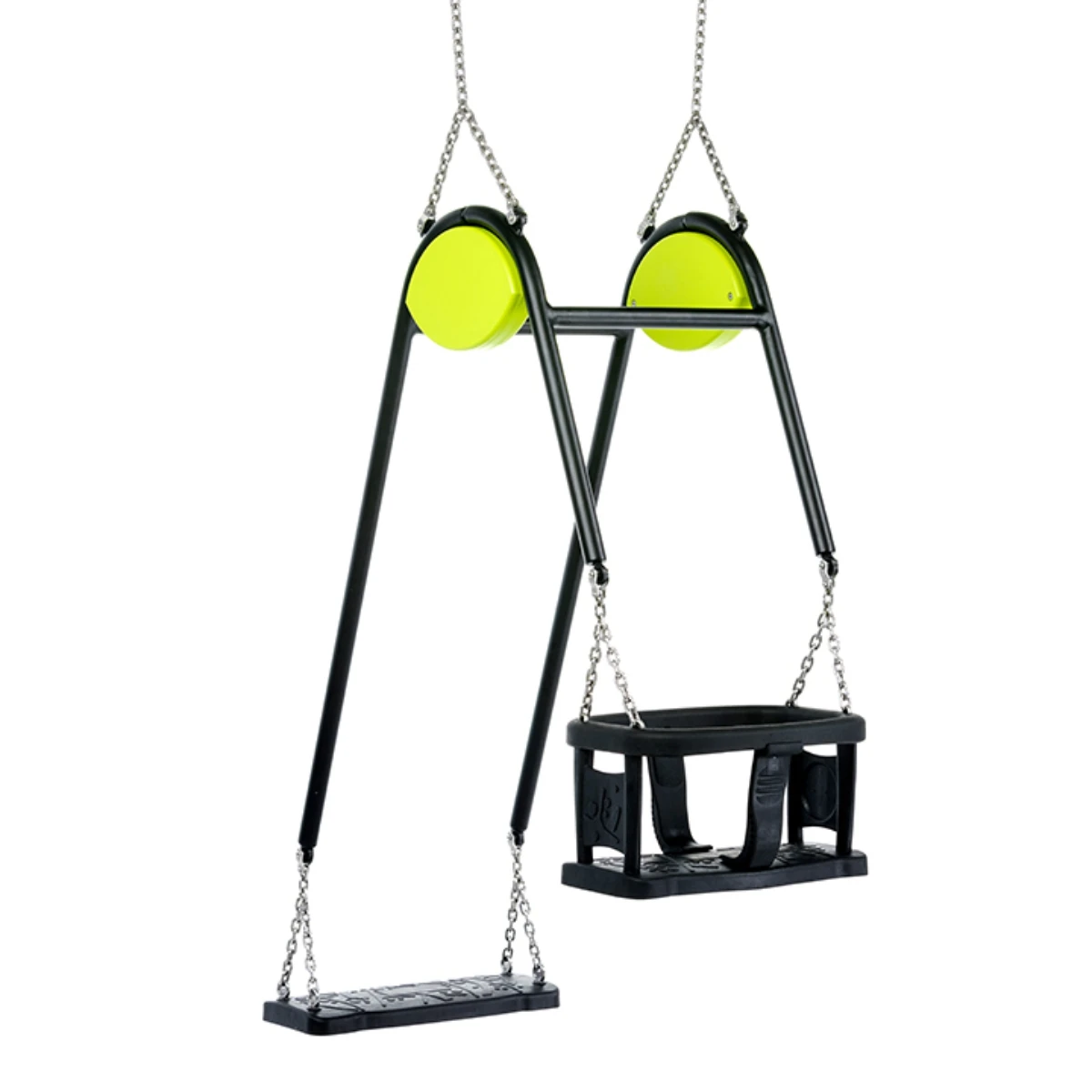 De familieschommel ‘CHAXI’ biedt een unieke nieuwe schommelervaring. Het frame bestaat uit twee afzonderlijke helften, die zijn gemaakt van gepoedercoate stalen buizen. Deze familieschommel is een combinatie van het rubberen ‘curve XL’ schommelzitje en het rubberen babyzitje ‘curve’.