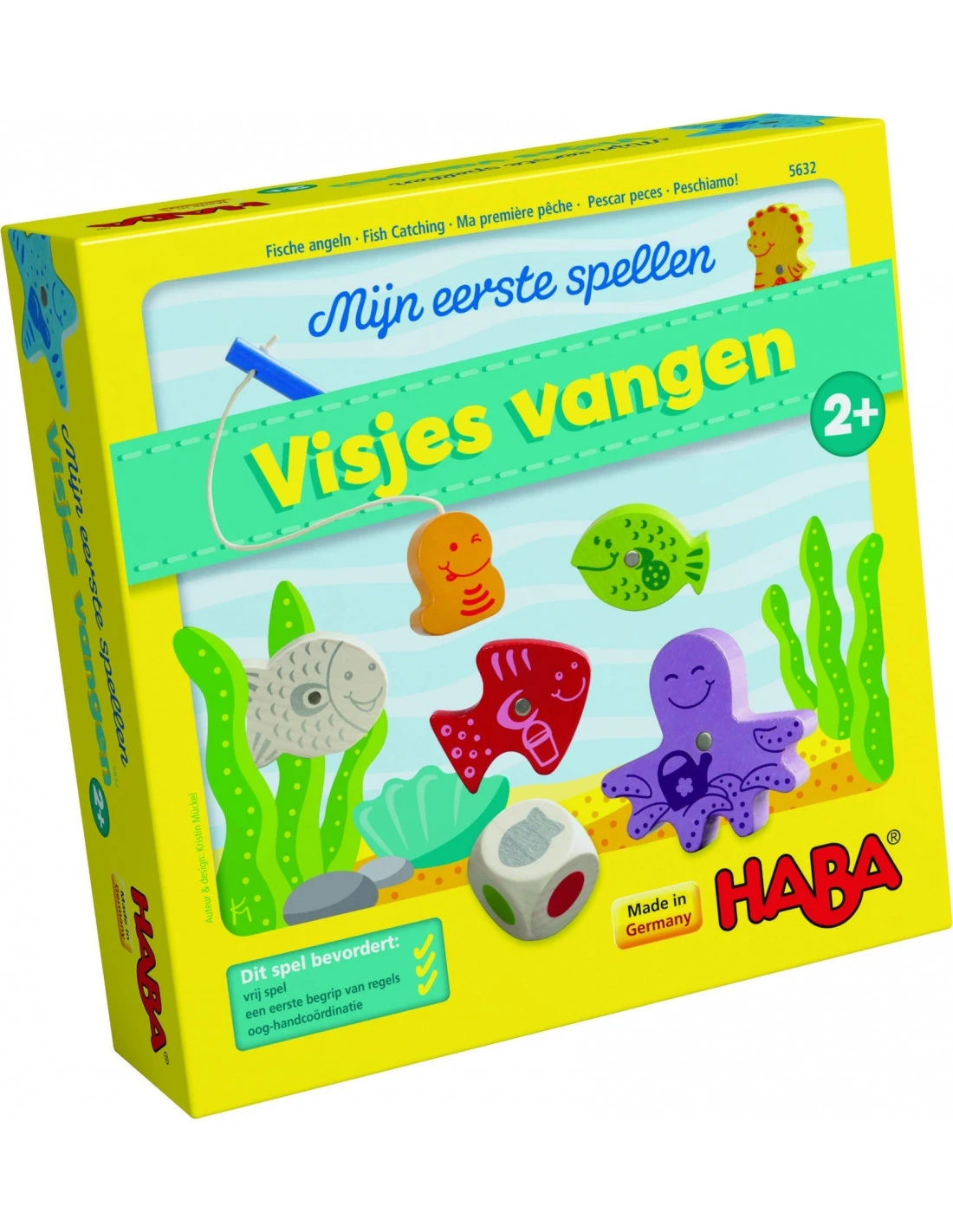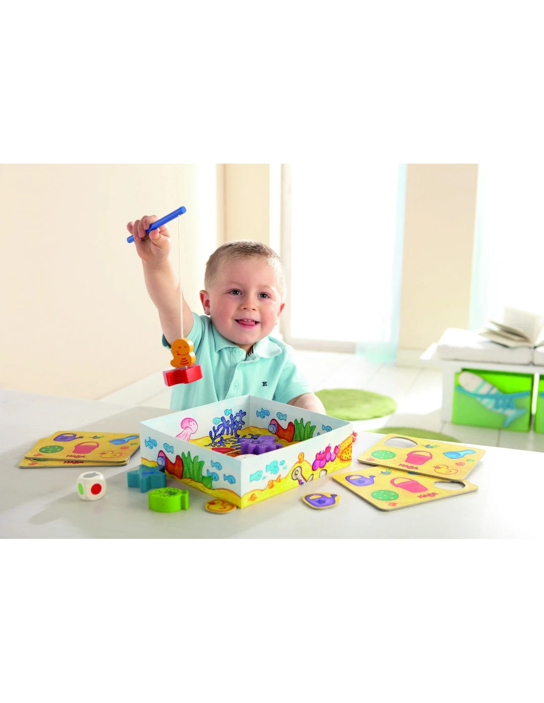 My Very First Games Here, Fishy, Fishy! is a first fishing game for 1-4 children age 2+. The game can be played as free play where a kid tries to catch fishes with a magnetic fishing rod or in a game where a kid tries to catch the fish determined by the color of a die. If successfull the fish rewards the kid with a gift. Who is the best fisherman and collects the different toys first?