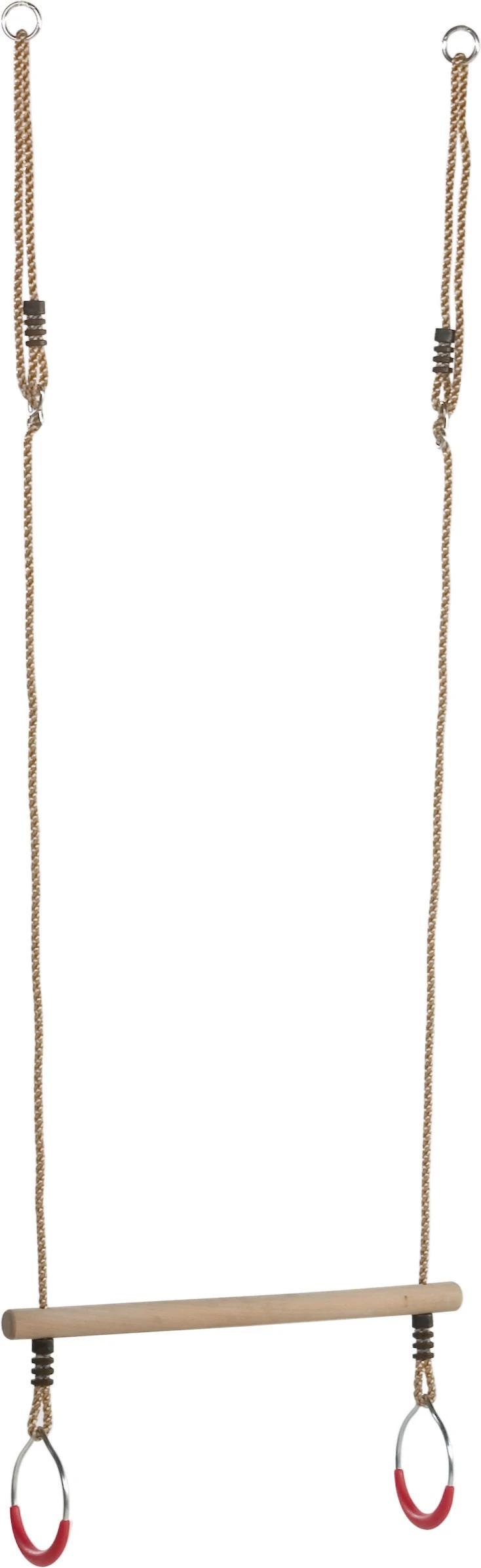 Combinatie van trapeze en metalen ringen met een doorsnede van 12 cm. De metalen ringen zijn voorzien van kunststof handgrepen. Compleet met 12 mm. PH-touwenset.