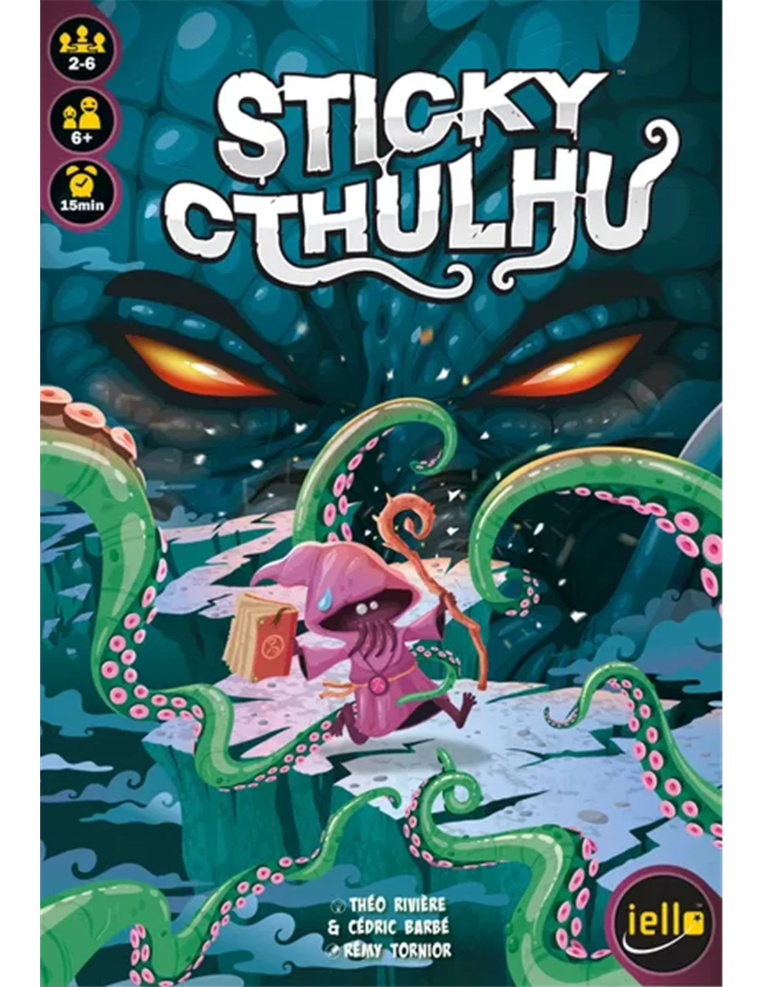 In Sticky Cthulhu, each player has a long sticky “tentacle”, and the table is covered with six types of creature tiles in six colors, along with a few investigator tokens.
