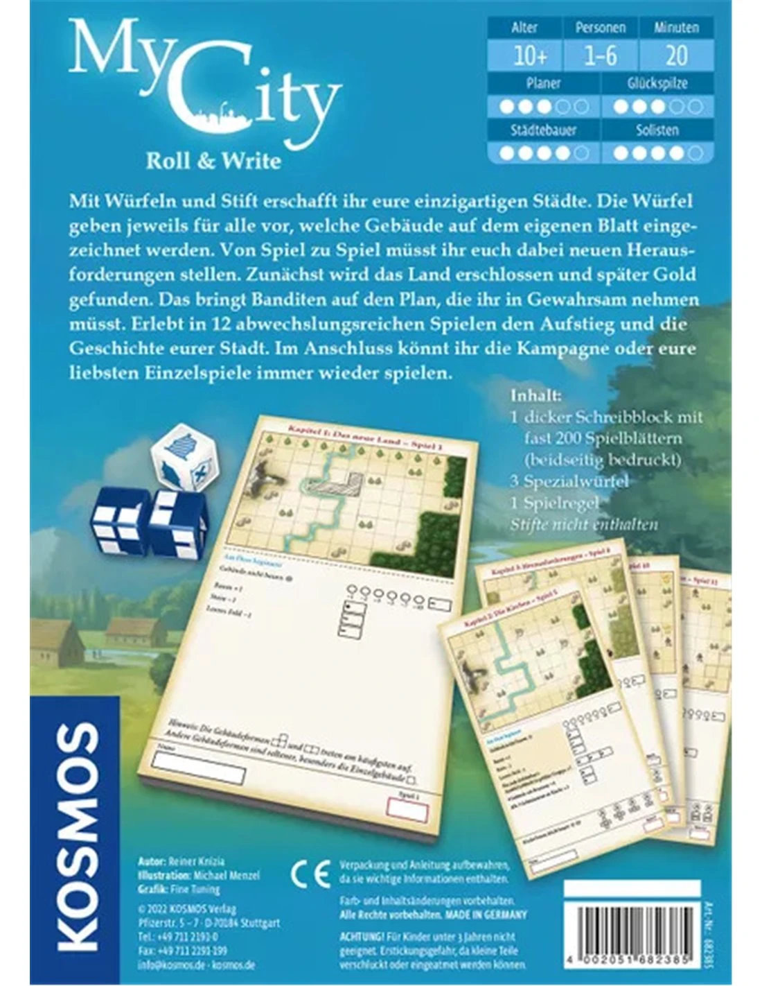 My City: Roll & Build is a dice game in which over four chapters, each with three episodes, you create a unique city. The roll of the dice shows everyone which building to draw on their game pad, and from episode to episode, you have to face new challenges. First the land is developed and later gold is found. This brings bandits into your city who must be surrounded and taken into custody.