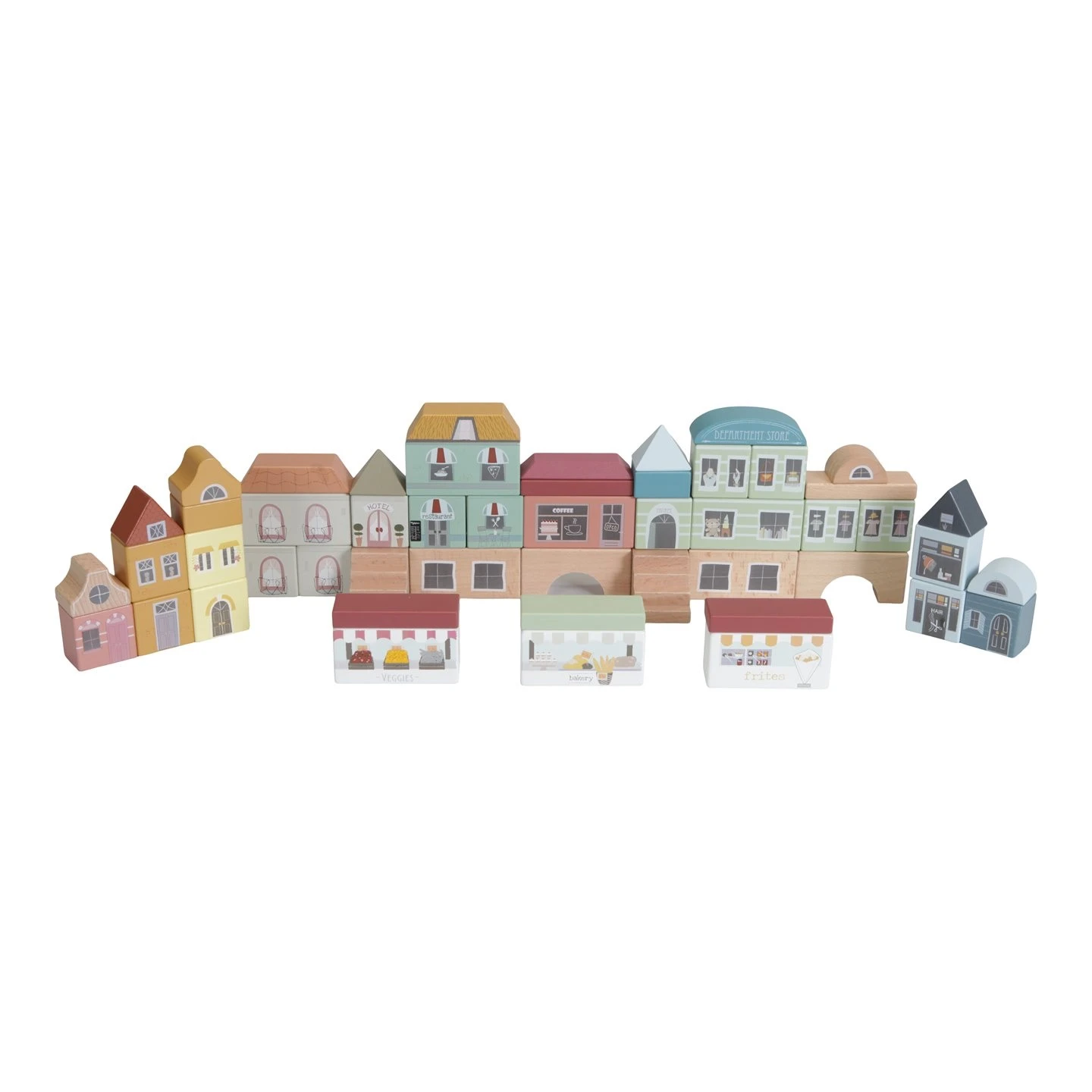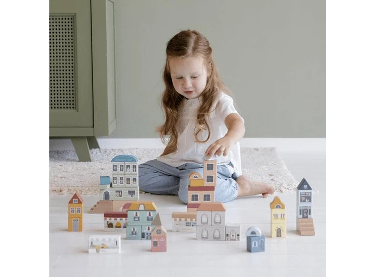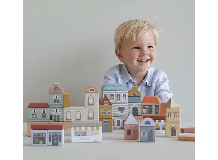 Deze speelset van Little Dutch is perfect te gebruiken in combinatie met de houten treinset. Het omvat 50 blokken om stadsgebouwen te creëren, zoals winkels, een hotel en een restaurant. Kinderen zullen genieten van het combineren van de verschillende bouwelementen, wat het spelen met deze blokken zo leuk maakt. Maak de stad compleet met de spoorwegtrein XXL-set en extra uitbreidingssets voor urenlang speelplezier.