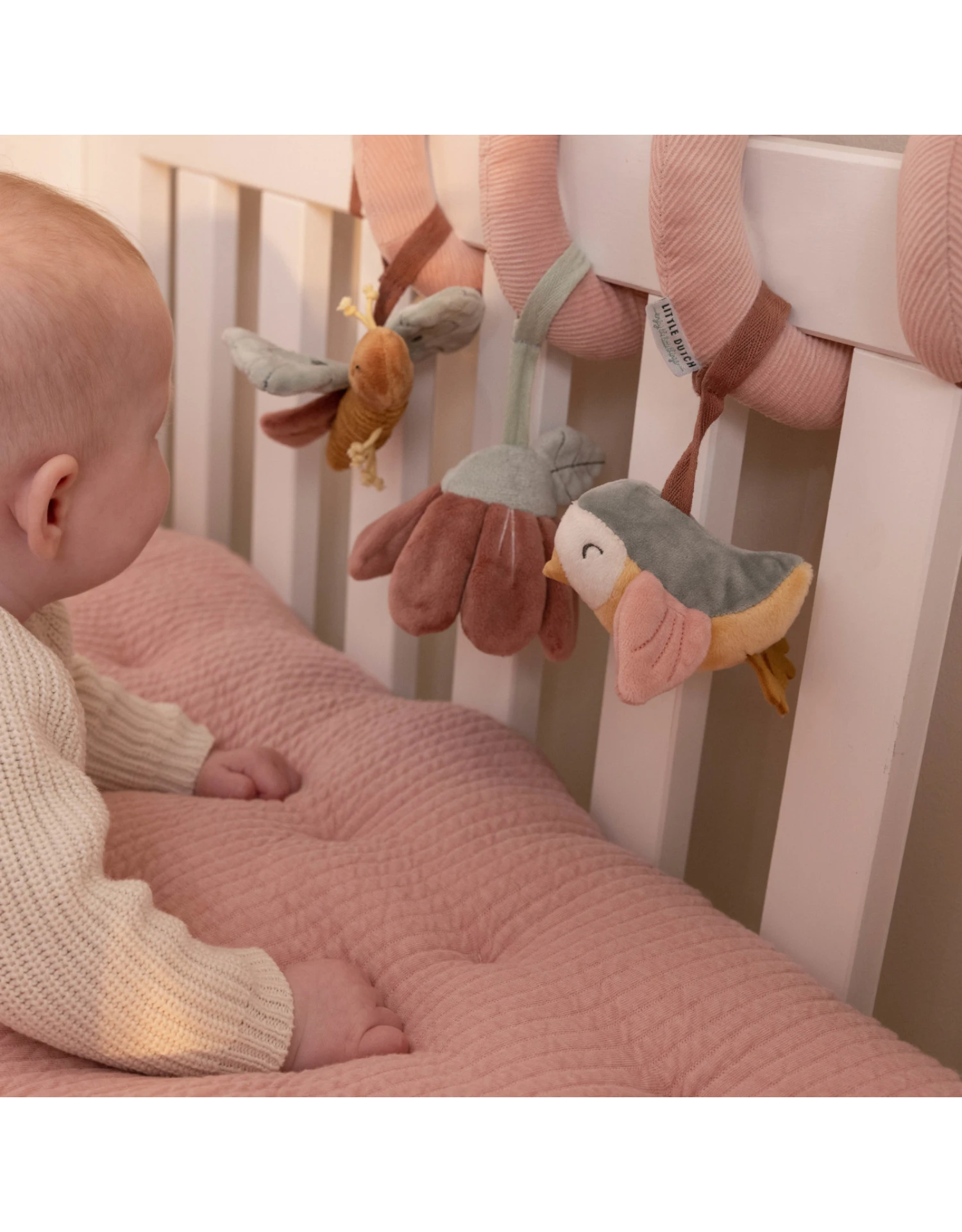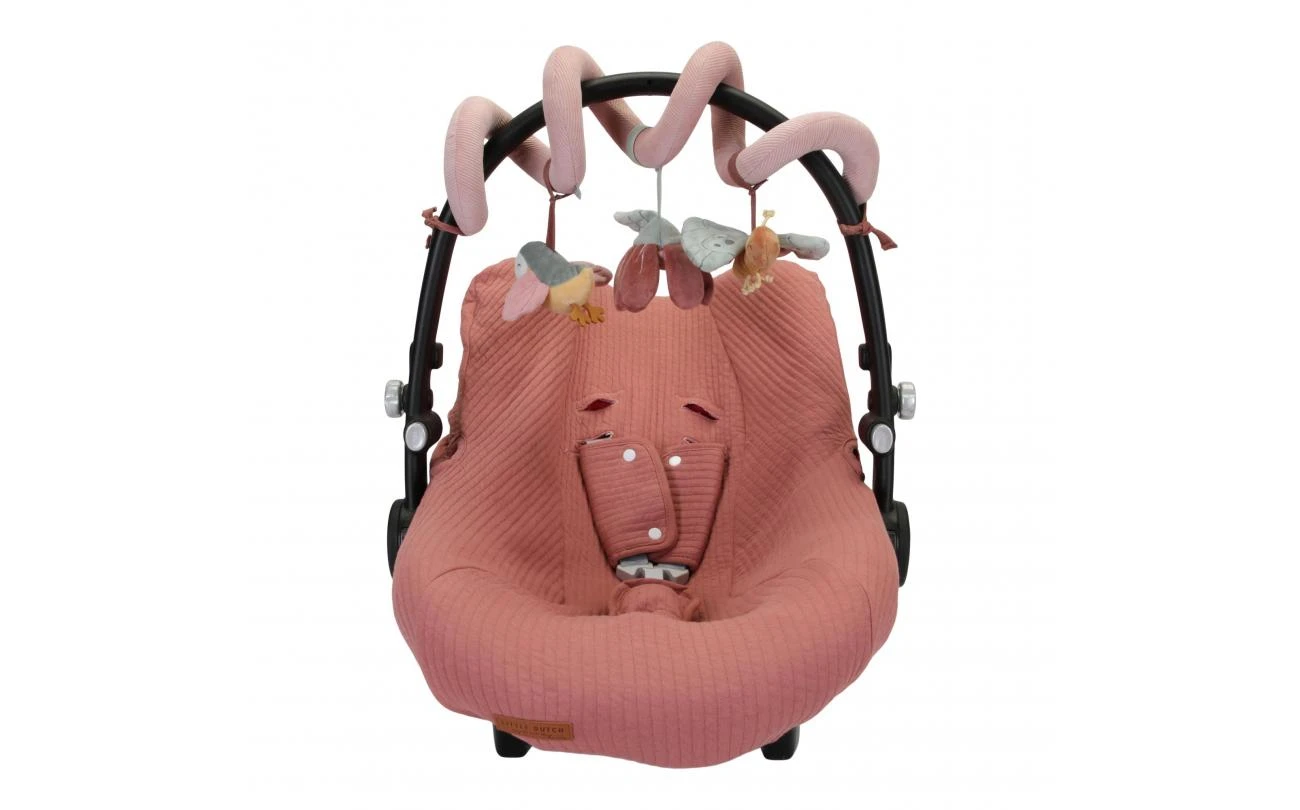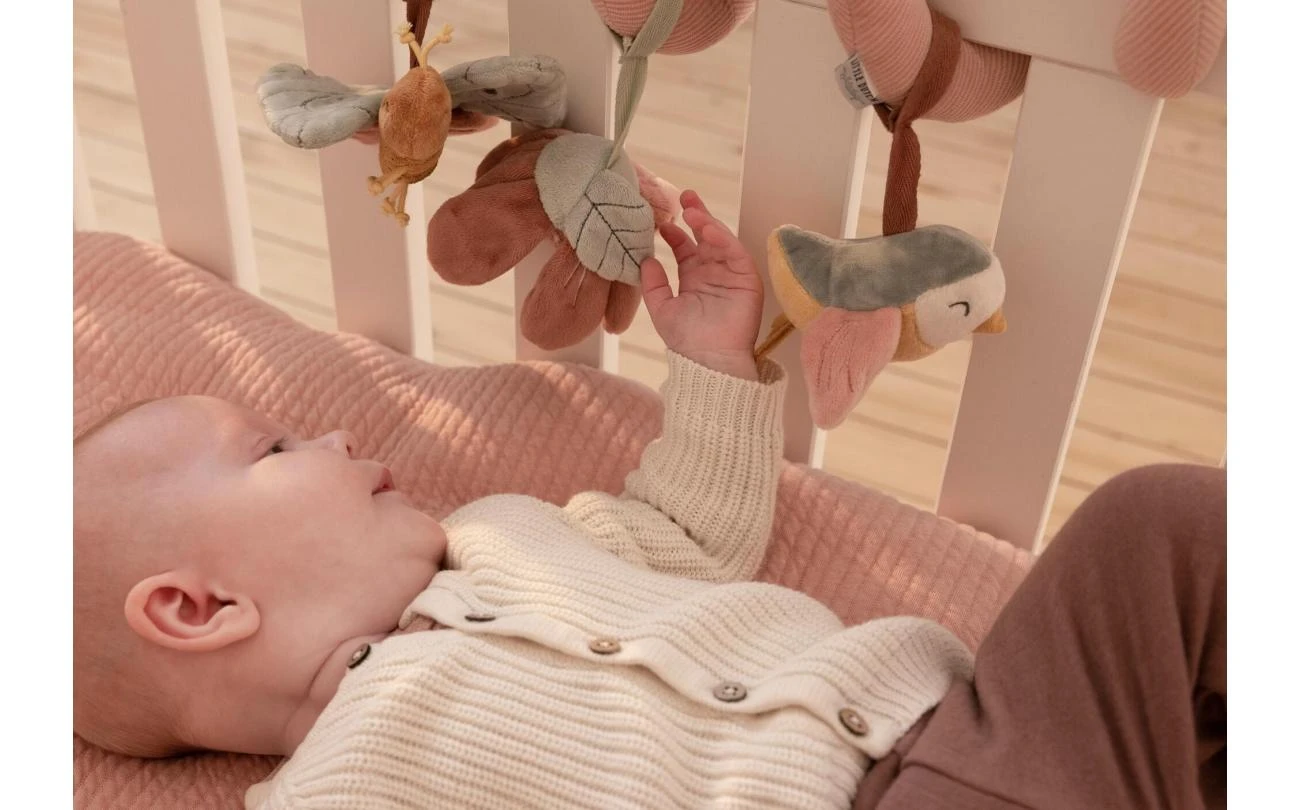 Kijk, voel en ontdek! Deze leuke en vermakelijke activiteitenspiraal zal baby’s zowel thuis als onderweg bezighouden. Bevestig dit praktische speelgoed eenvoudig aan alles van wieg tot box of autostoeltje. Het versterkt de zintuigen en stimuleert de hand-oog coördinatie. De activiteitenspiraal is gemaakt van corduroy met katoen en draait om een klein vogeltje, een kleurrijke vlinder en een fascinerende bloem die een ratelend geluid maakt.
