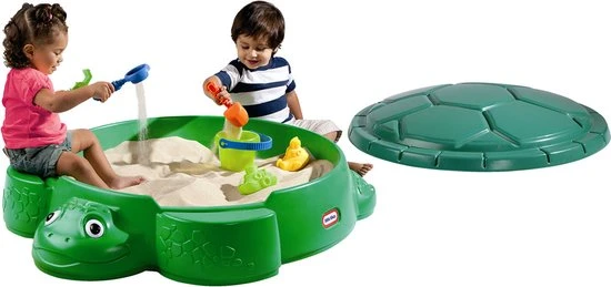 De Little Tikes Schildpad zandbak is een robuuste groene zandbak met deksel. De rand heeft twee brede stukken, waar het kind op kan zitten.