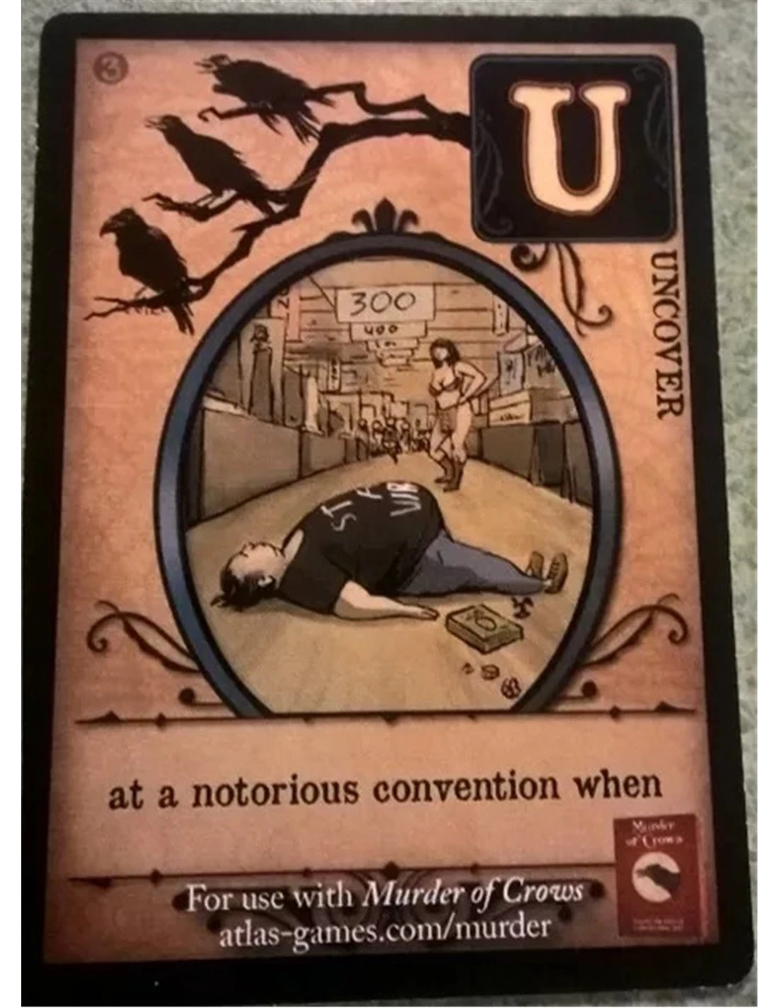Free promotional card for Murder of Crows card game. This card adds an additional “U” card for building your murder. As “U” cards are the location of your murder, this card has the murder take place “…at a notorious convention when…”