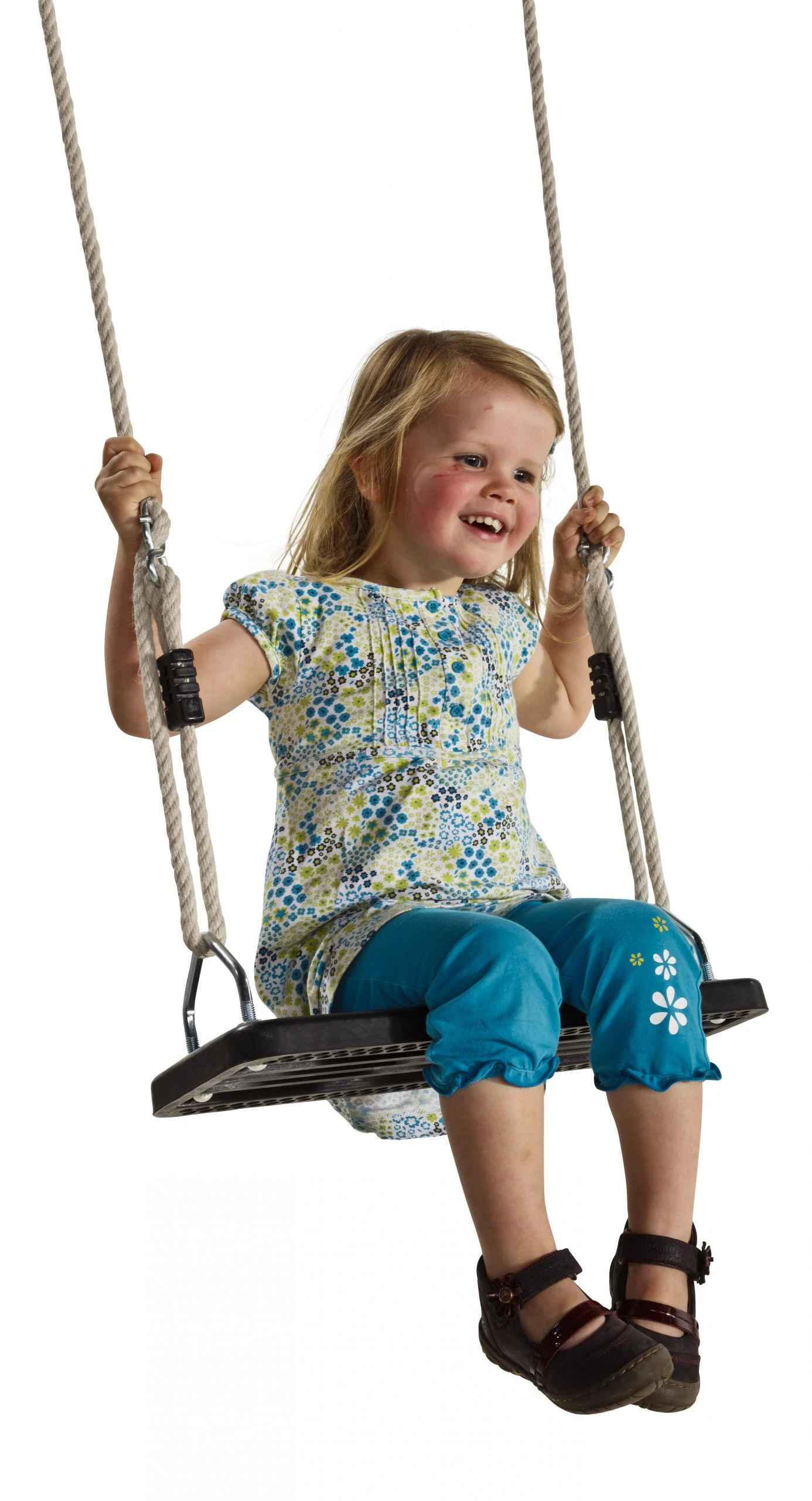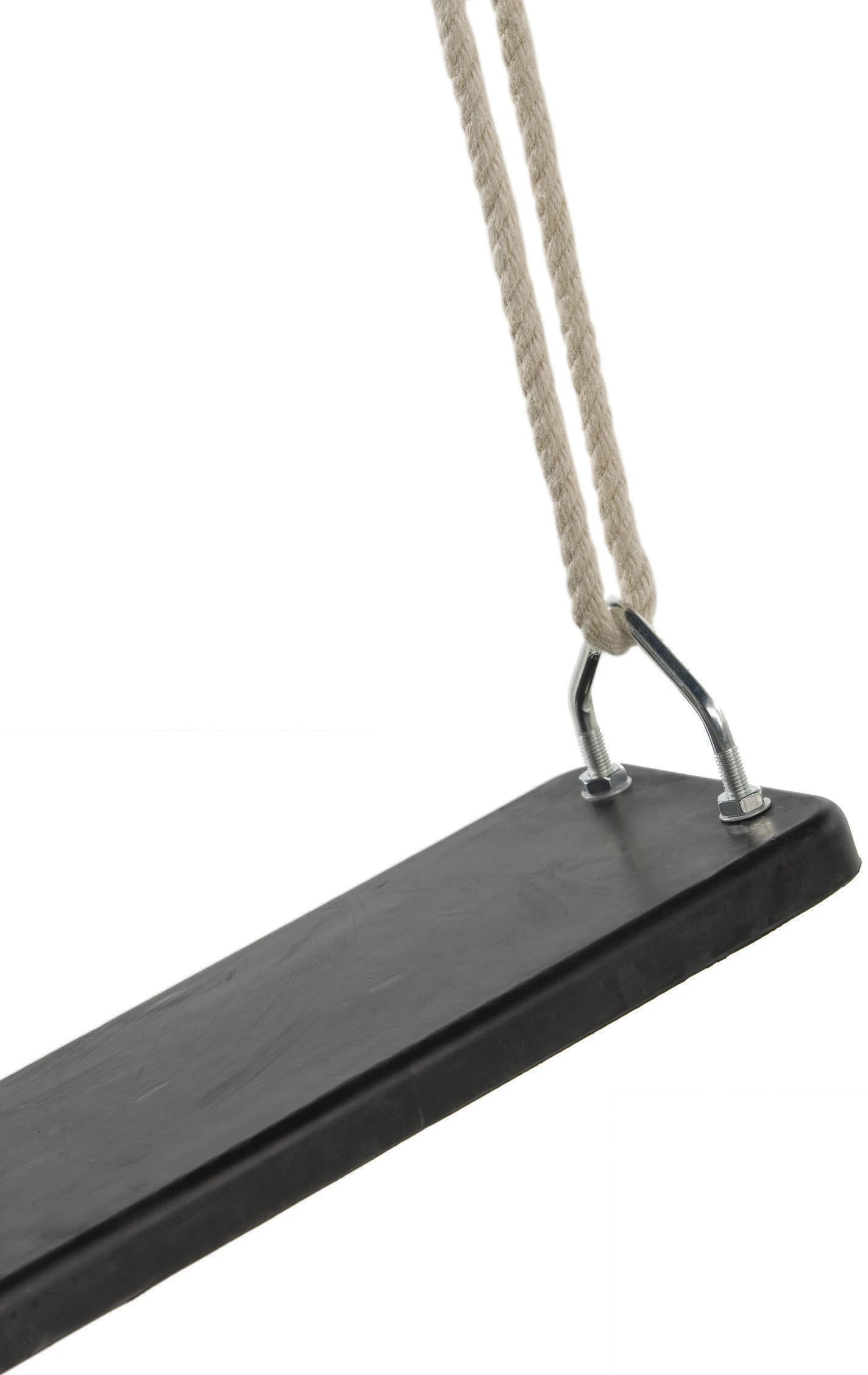 Rubber schommelzitje, stalen binnenplaat, met 12 mm. PH-touwenset. Beugels, stelachten en ophangogen uit gegalvaniseerd staal. Zwarte kunststof lassen als touwverbinding.