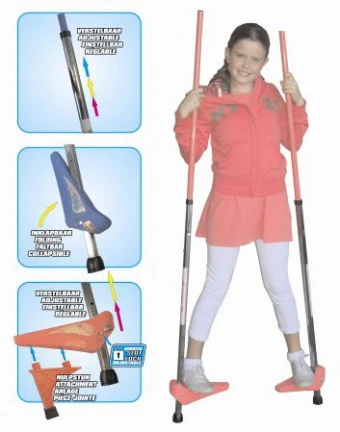 Meervoudig verstelbare stelten in kobaltblauw en rose. Compleet met extra steun voor beginners, welke verwijderd kunnen worden wanneer de vaardigheid en het zelfvertrouwen dit toelaten. De stelten kunnen versteld worden in lengte van 160-180 cm.