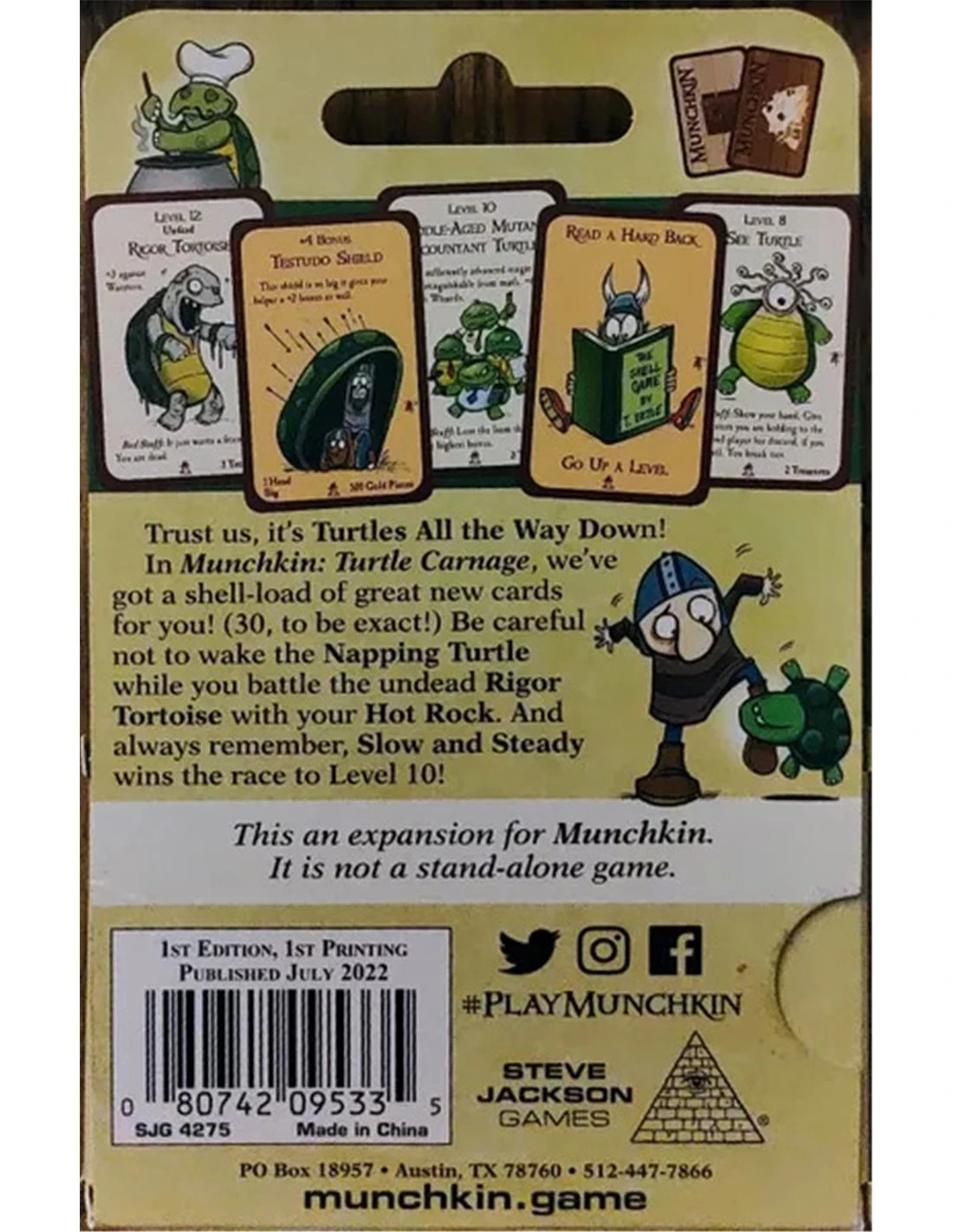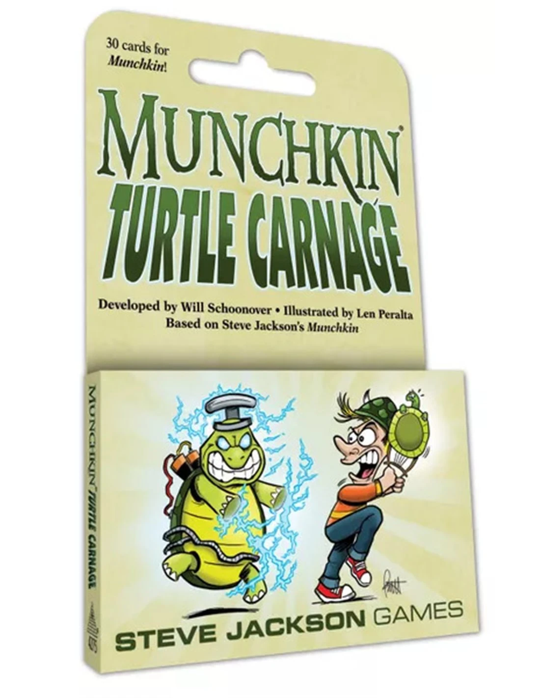 In Munchkin: Turtle Carnage, we’ve got a shell-load of great new cards for you! (30, to be exact!) Be careful not to wake the Napping Turtle while you battle the undead Rigor Tortoise with your Hot Rock. And always remember, Slow and Steady wins the race to Level 10!