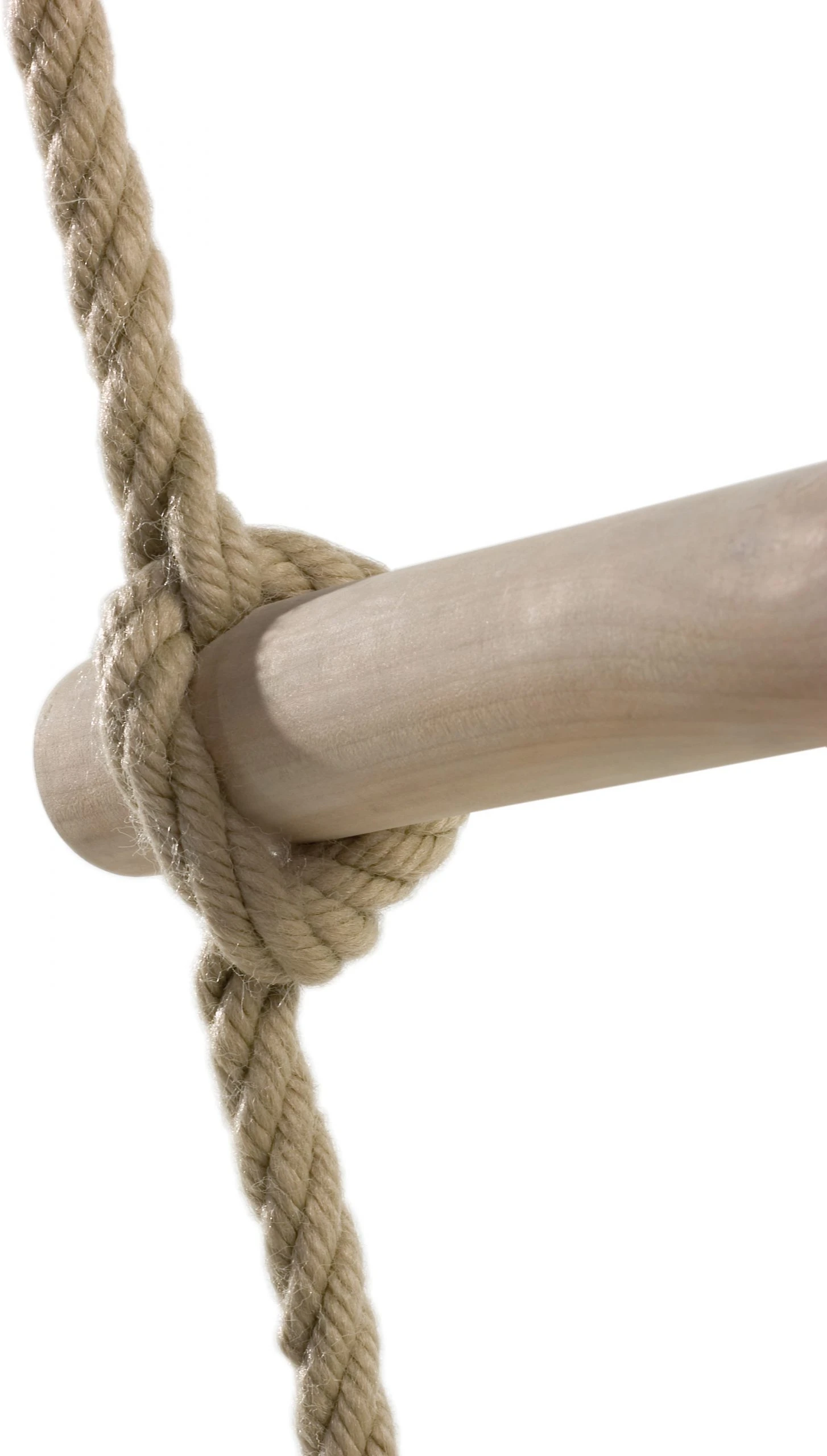 Diameter 35 mm; lengte 400 mm en PH touwen diameter 12 mm door-en-rondom de sporten geknoopt. Afstand tussen de sporten 350 mm; de lengte van het bovenste touweind varieert.