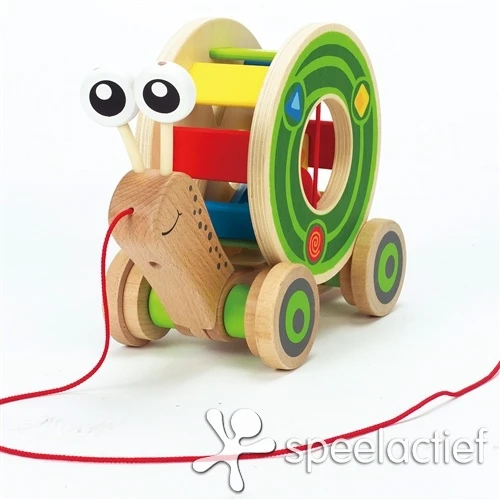 Deze veelzijdige slak draagt in zijn slakkenhuis houten blokken terwijl hij je volgt. De sorteerder draait rond tijdens het voortbewegen en je kunt hem ook als losse blokkenstoof gebruiken.