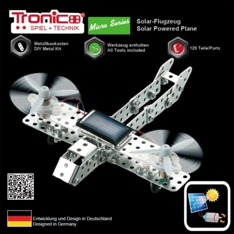 Bouwdoos waarmee een solar aangedreven helikopter of vliegtuig gebouwd kan worden. In schaal 1 : 64. Er zijn 4 verschillende modellen.