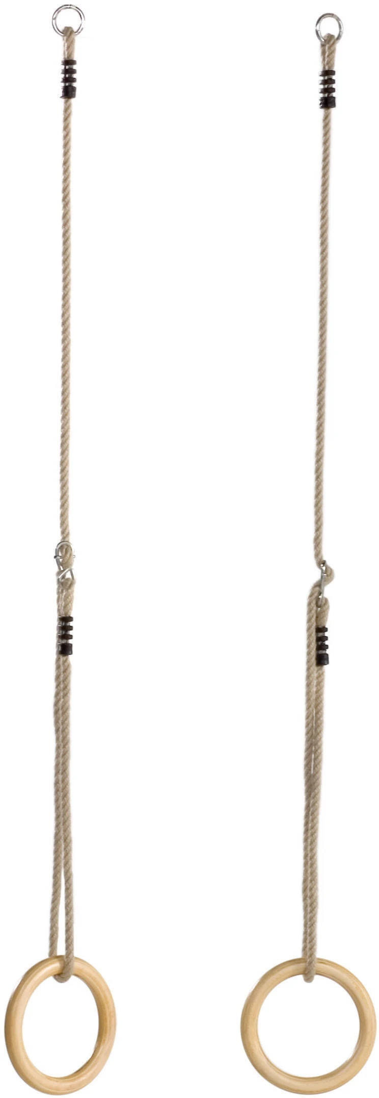 Deze turnringen liggen heel fijn in de hand. Net als in de sportzaal. Compleet met 12 mm. PolyHemp-touwenset. Deze ringenset mag niet buiten blijven hangen! De ringen zijn gemaakt uit vernist multiplex, de ophangringen en stelachten zijn uit gegalvaniseerd staal.