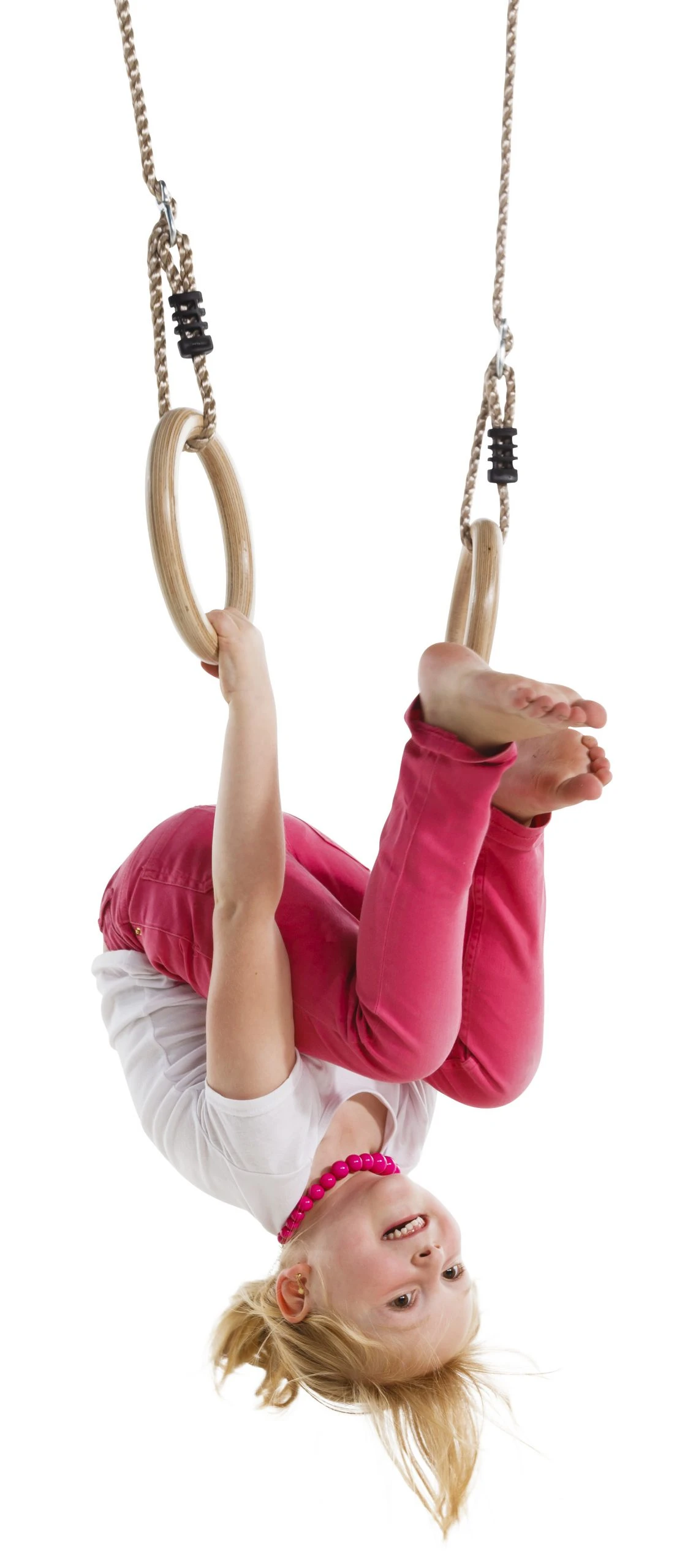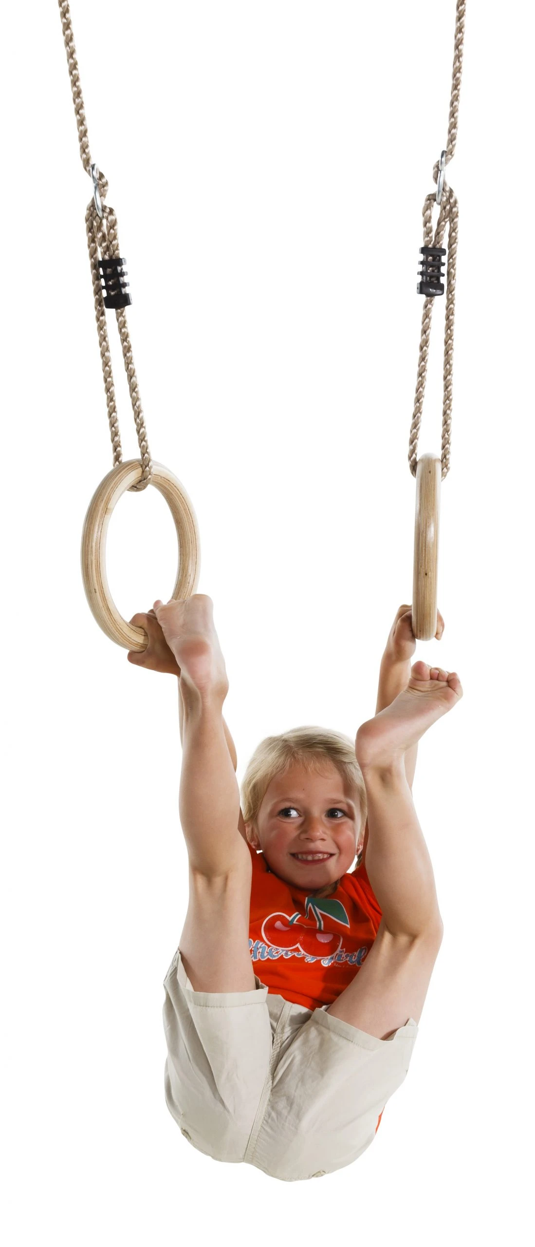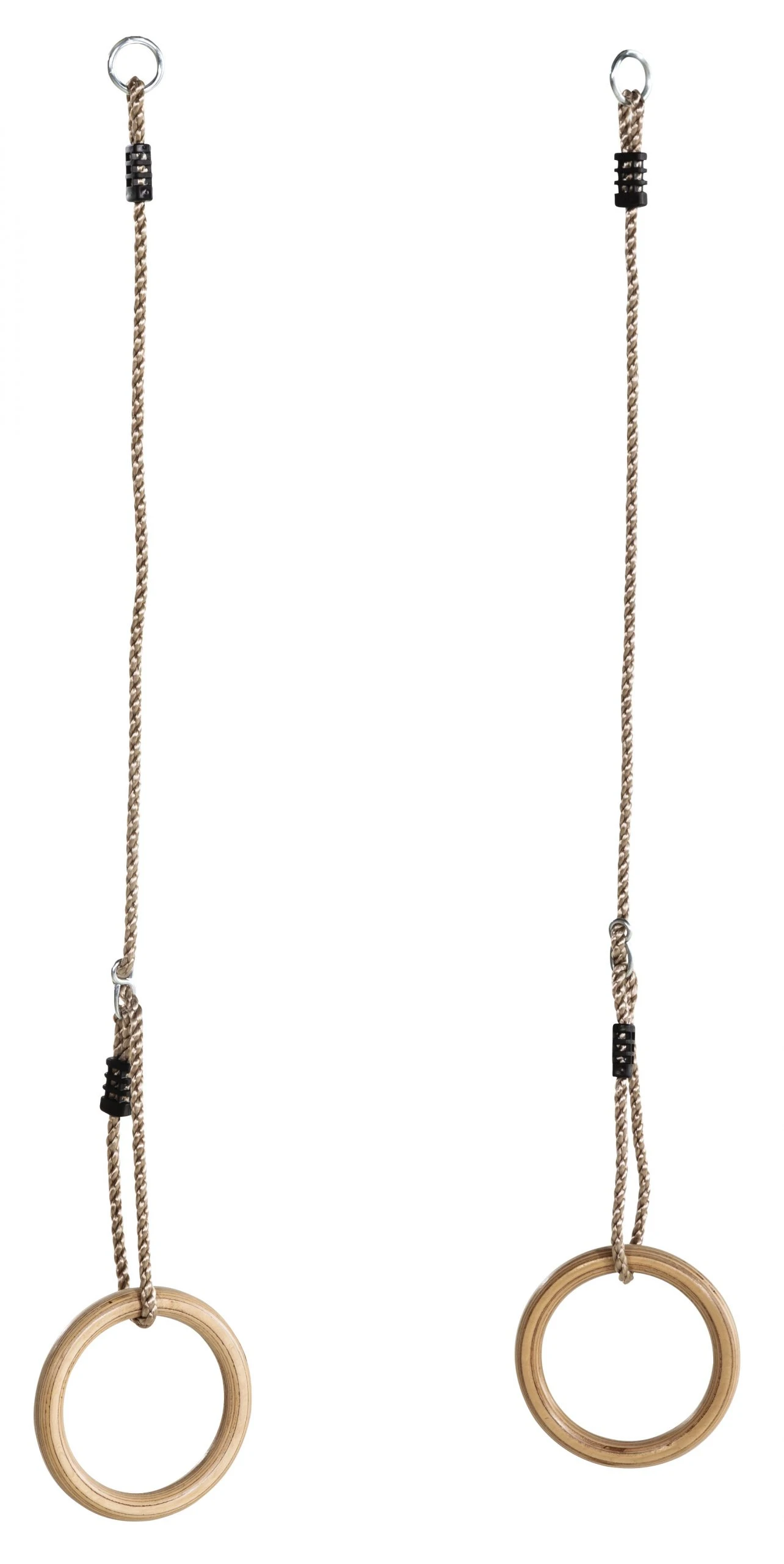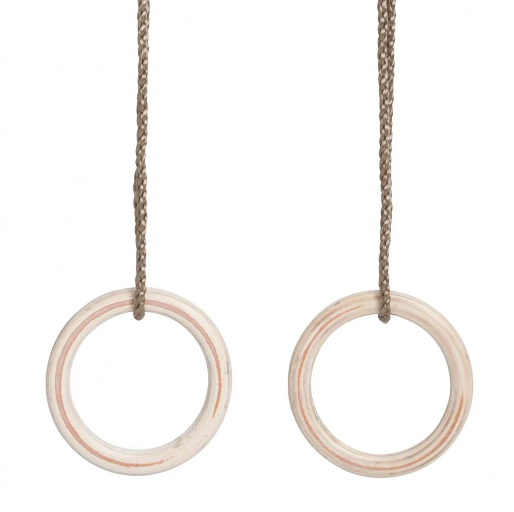 Net als in de sportzaal. Compleet met 10 mm. PolyPropyleen-touwenset. Deze ringenset mag niet buiten blijven hangen; de ringen zijn nl.gemaakt uit vernist multiplex. De ophangringen en stelachten zijn uit gegalvaniseerd staal