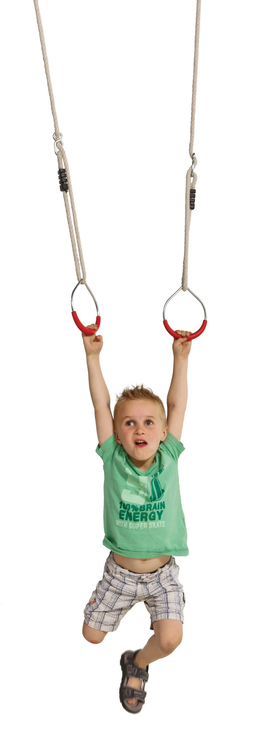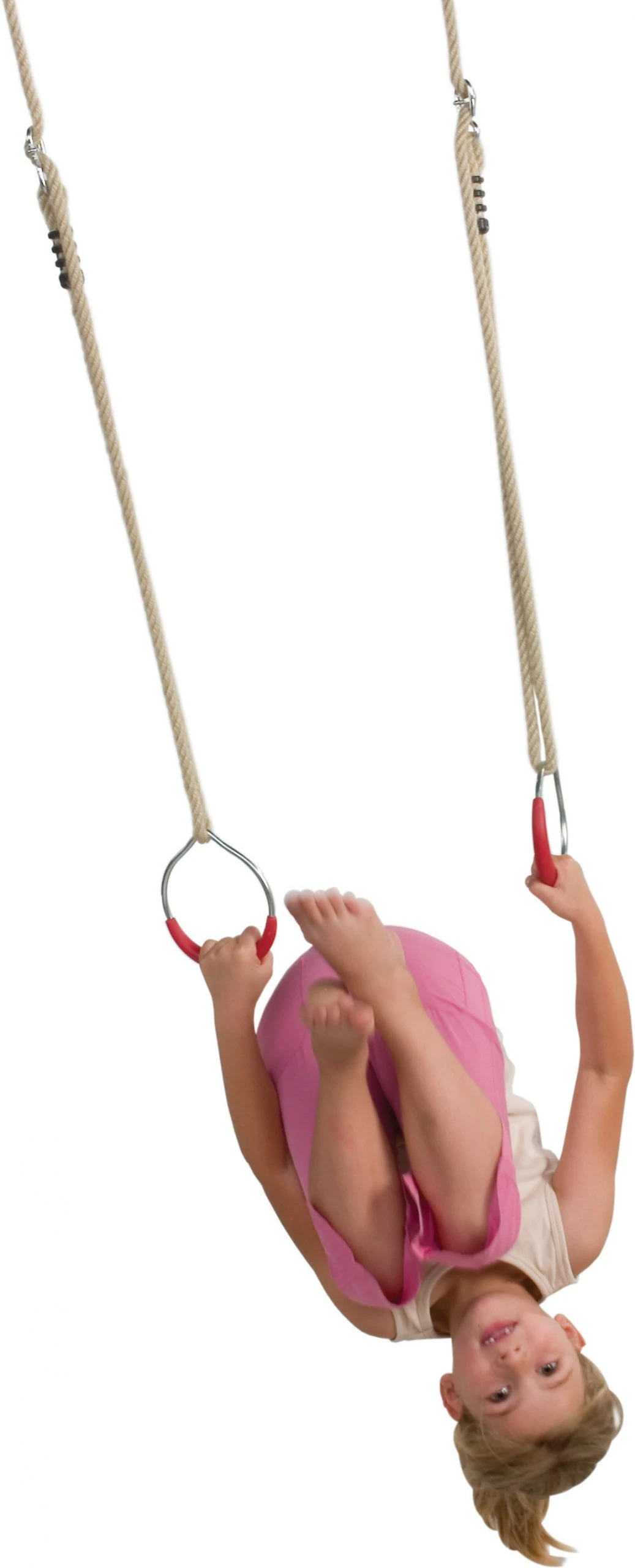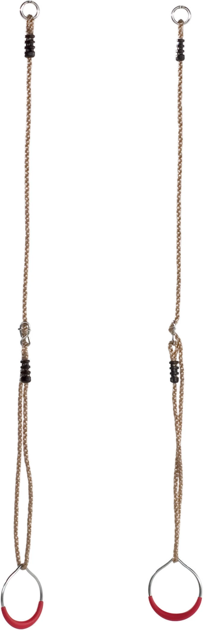 Metalen turnringen met een rood kunststof handgreep. De ringen hebben een diameter van 12 cm. De ringenset wordt geleverd incl. de 12 mm. PH-touwenset, welke voorzien zijn van gegalvaniseerde stelachten en ophangogen en de touwverbindingen zijn uitgevoerd met kunststof lassen.