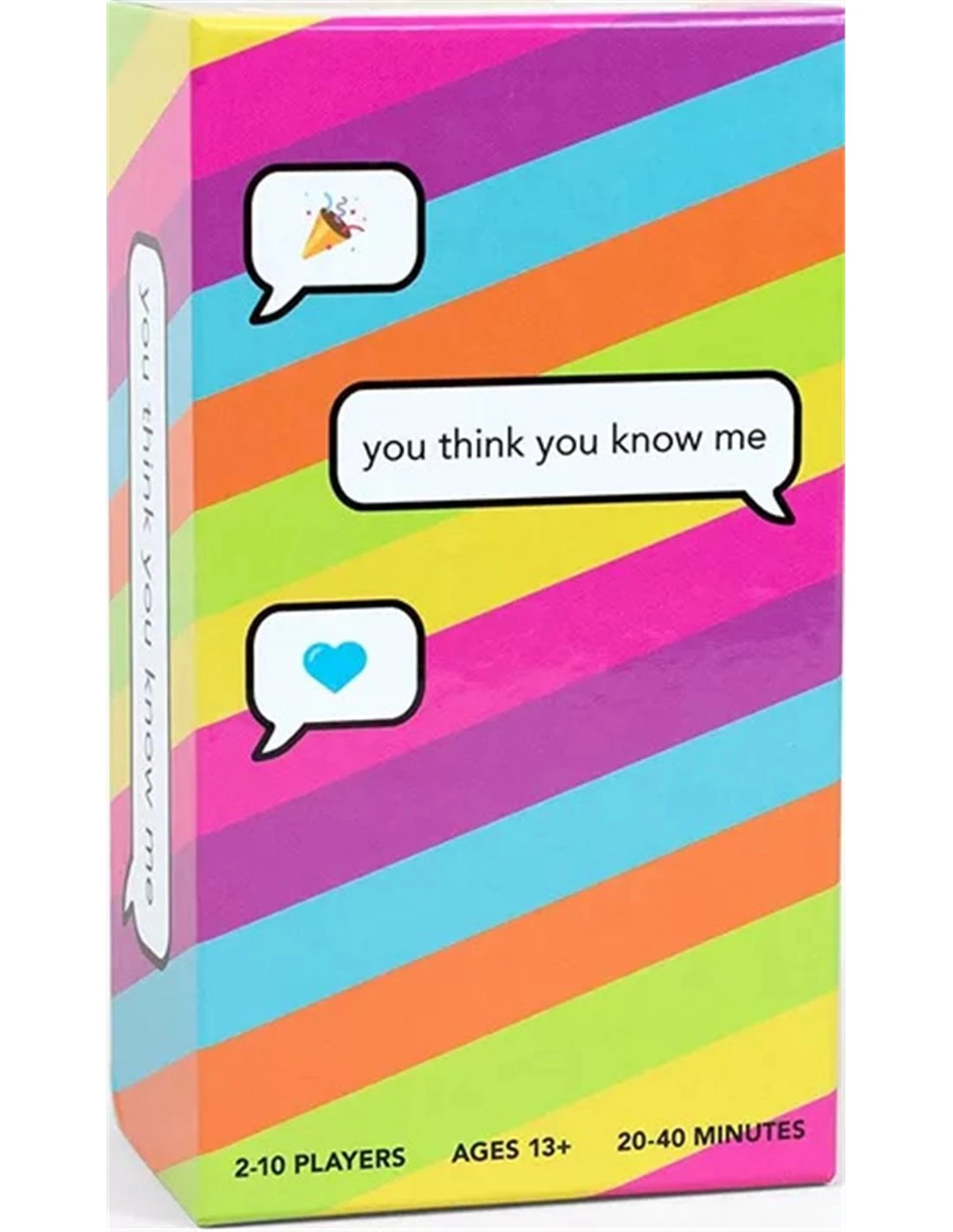 You Think You Know Me playfully tests how well you know your friends, giving you a chance to learn more about what they love and who they are. Each player starts with seven cards in hand, cards that say things like “I know that your secret talent is ________” or “I know that you would/wouldn’t want to live forever.” On a turn, you pick another player, play a card from hand, and say how you think they would answer the question. If you’re right, you discard the card; if not, you have to draw a new card and add it to your hand. Whoever first discards all their cards wins.