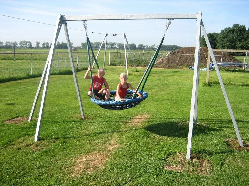Zeer stevig schommelframe van 6 stalen staanders van thermisch verzinkt staal met bovenin een zware thermisch verzinkte schommelbalk met zwaluwnestschommel.